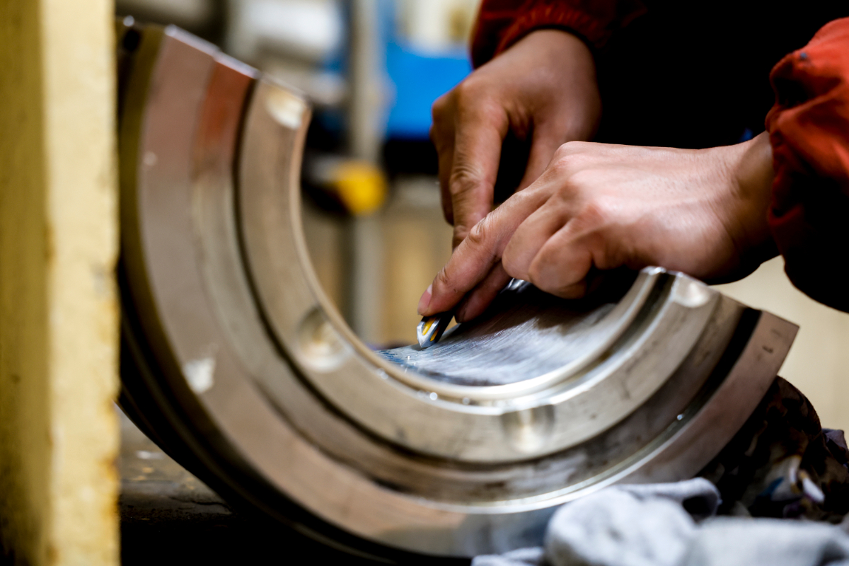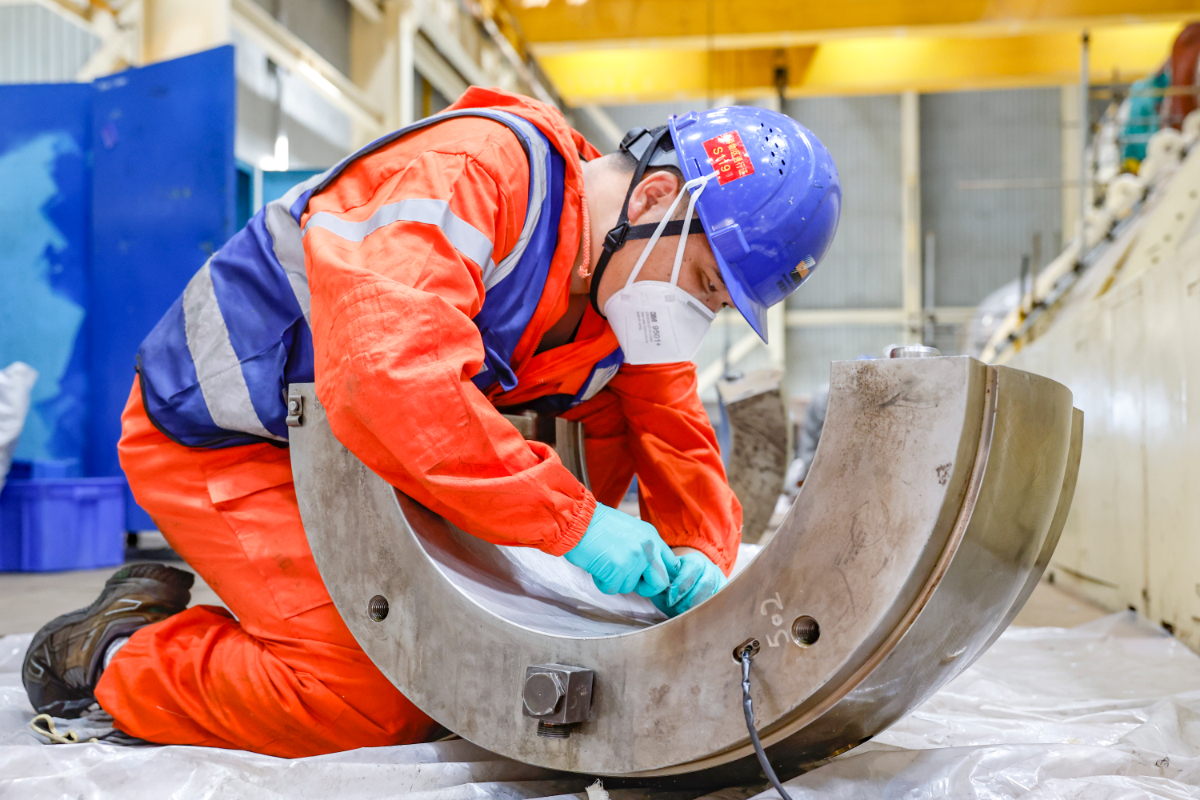 嘉電檢修人員手持“柳葉刀”進行軸瓦修刮。 王侃 攝