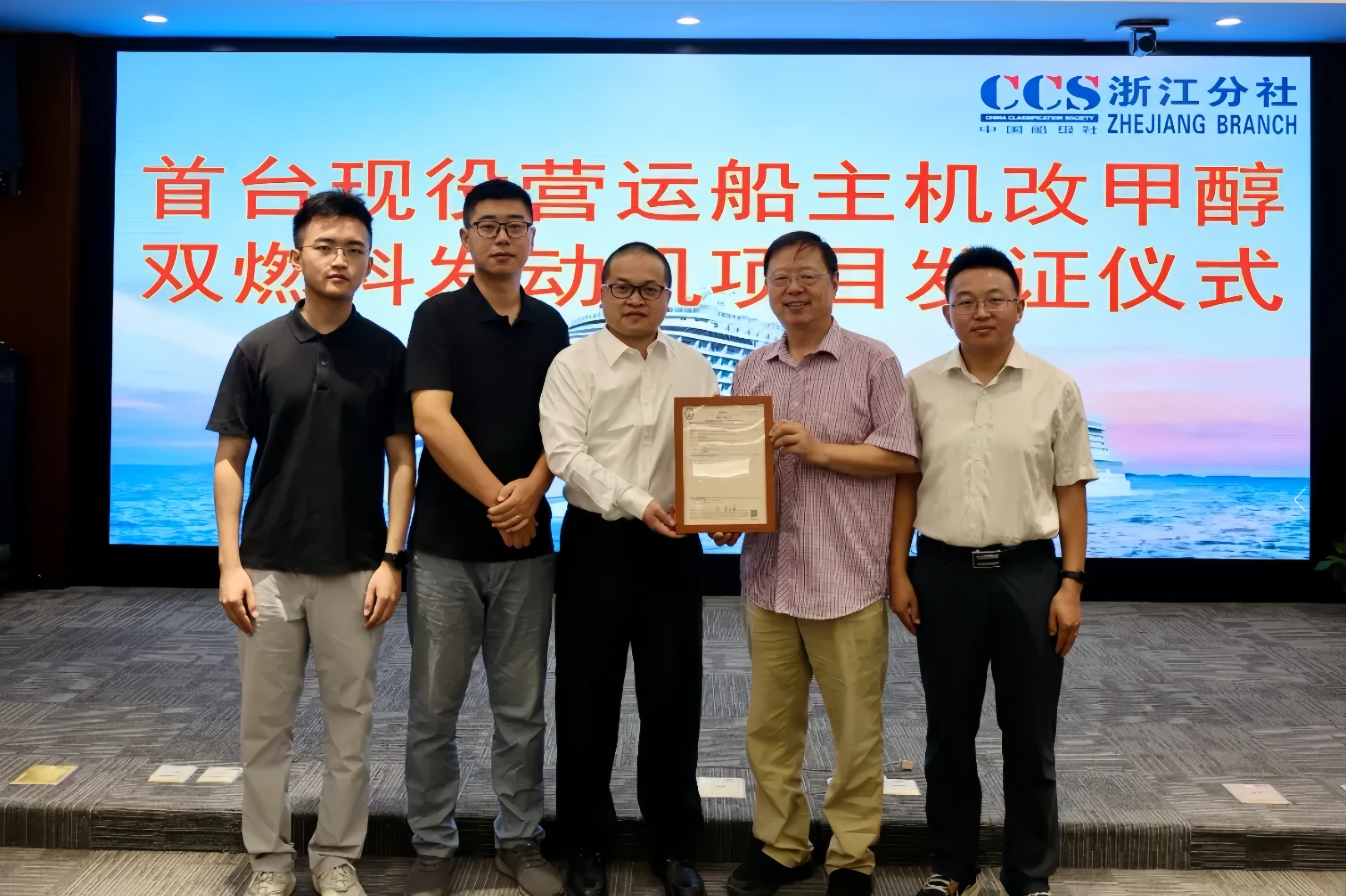 浙能邁領“領先1”輪主機獲頒首臺現(xiàn)役營運船主機改裝為甲醇雙燃料發(fā)動機項目證書。 中國船級社浙江分社 提供