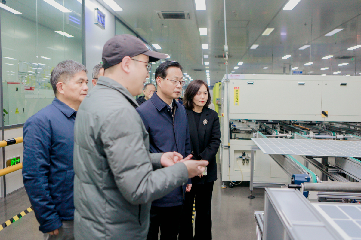 集團(tuán)黨委書記、董事長劉盛輝考察中來股份組件車間和電池研發(fā)中心等現(xiàn)場(chǎng)。 中來股份 提供