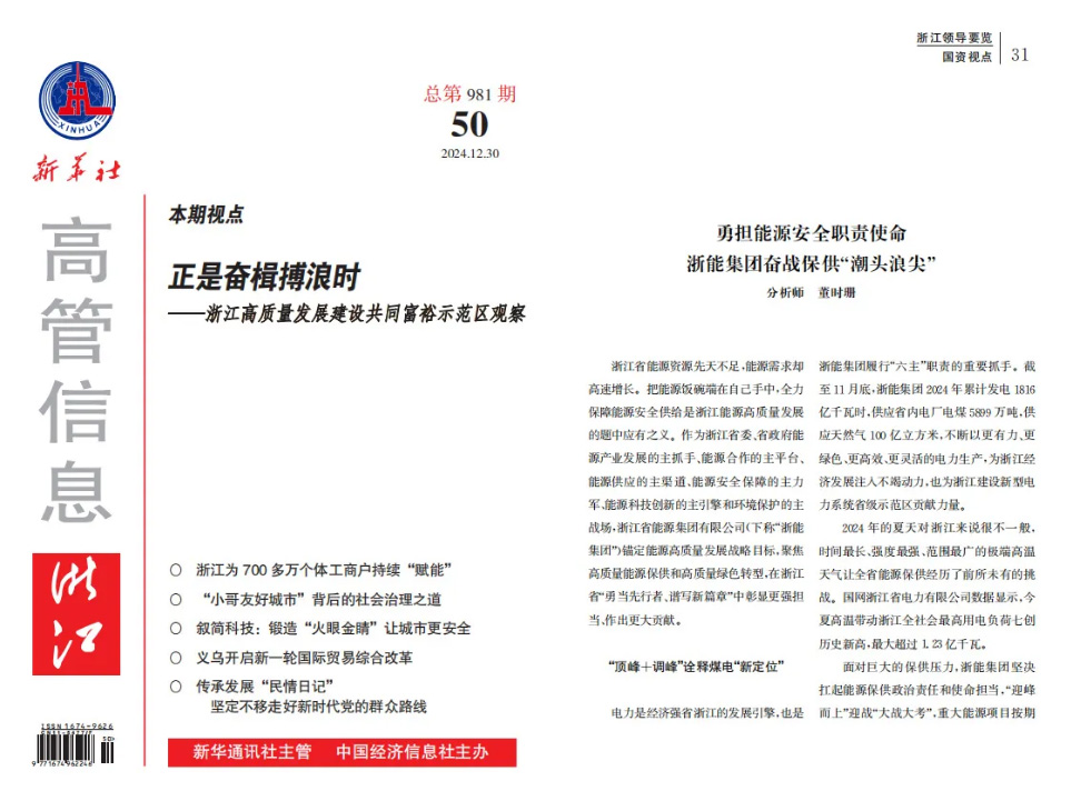 新華社《社高管信息》報道《勇擔能源安全職責使命 浙能集團奮戰保供“潮頭浪尖”》 新華社《社高管信息》 圖