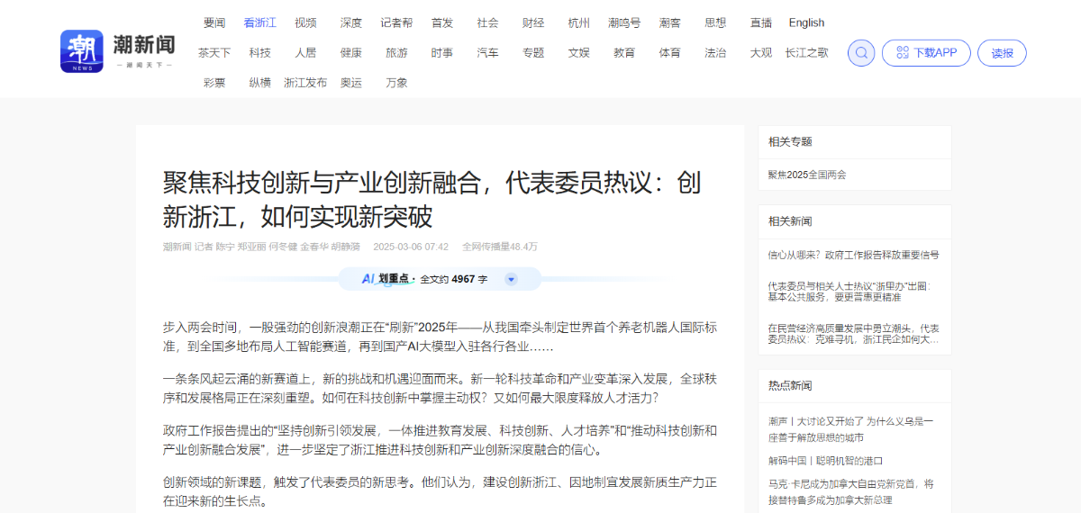 潮新聞報道《聚焦科技創新與產業創新融合,代表委員熱議——創新浙江,如何實現新突破》。 潮新聞客戶端 圖