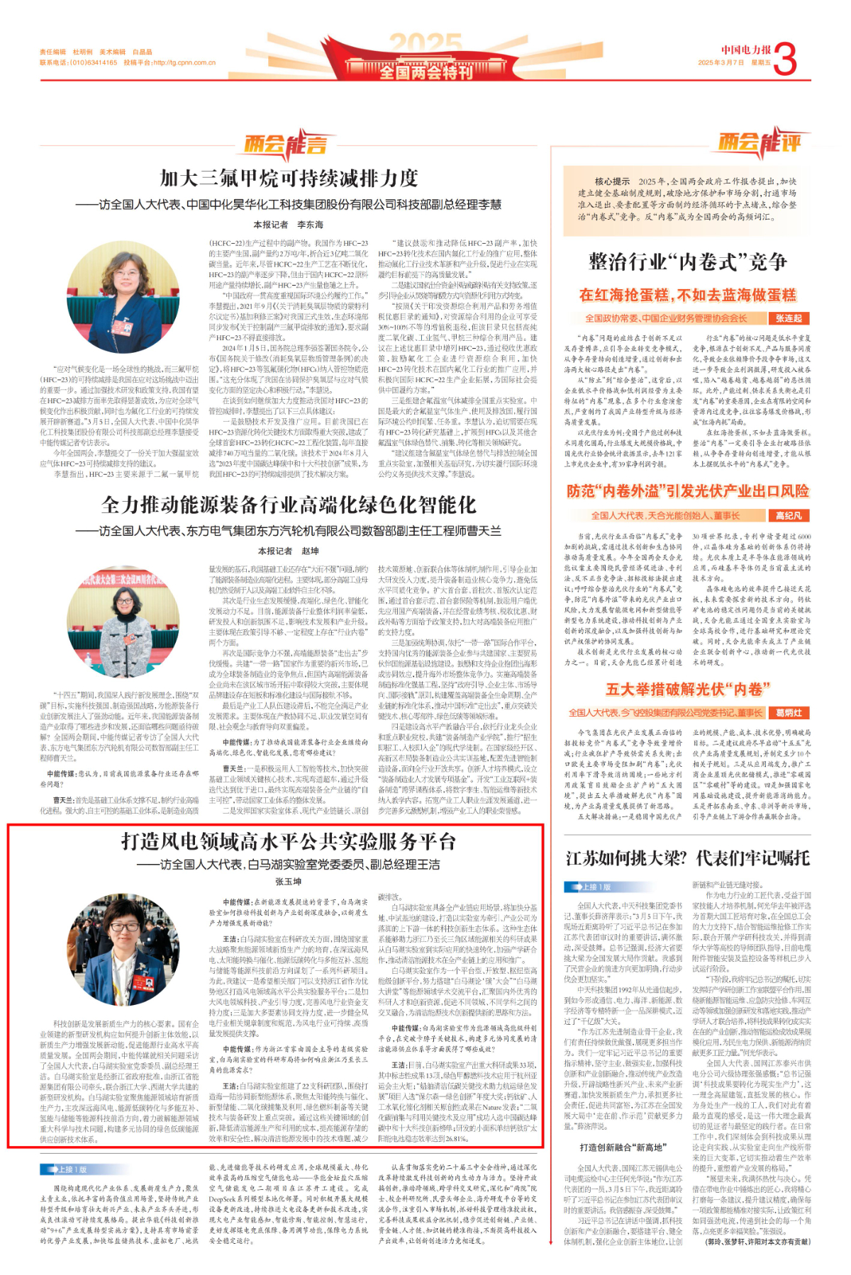 《中國電力報》報道《全國人大代表王潔:打造風電領域高水平公共實驗服務平臺》。 中國電力報 圖