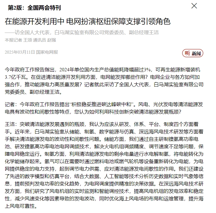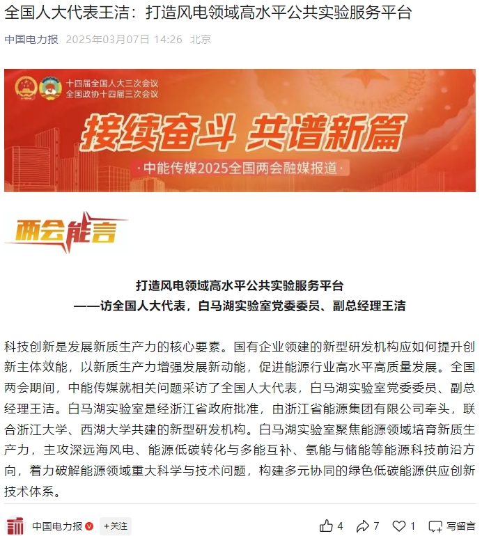《中國電力報》微信公眾號報道《全國人大代表王潔:打造風電領域高水平公共實驗服務平臺》。 中國電力報微信公眾號 圖