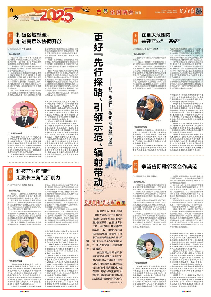 江蘇省委機關報《新華日報》全國兩會特刊長三角一體化相關主題稿聚焦全國人大代表、浙能集團王潔同志。 新華日報 圖