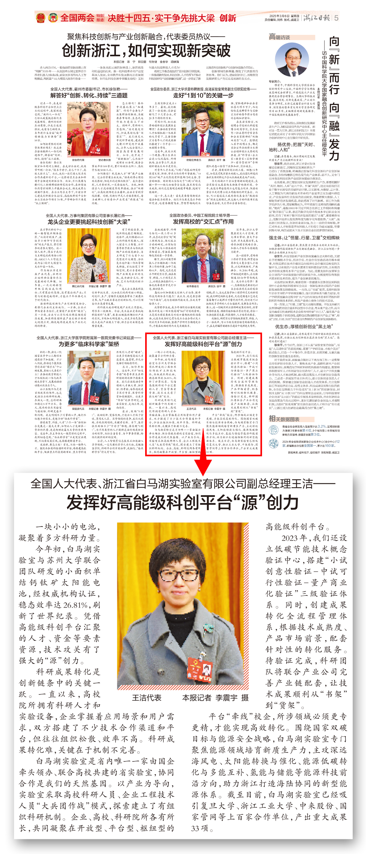 《浙江日報》全國兩會特別報道《全國人大代表、浙江省白馬湖實驗室有限公司副總經理王潔——發揮好高能級科創平臺“源”創力》。 浙江日報 圖