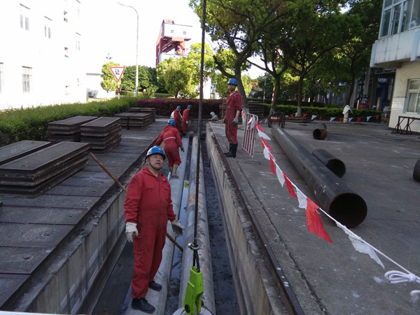 在管道施工現場,紛紛拉起了安全警戒線。轟鳴的吊機啟動聲,紅色連體服四處都是,一塊塊沉重的蓋板被吊起,堆放在一處。撬棒、打水泵、手拉葫蘆、吊繩、扣環等工作器具擺放得整整齊齊,這場管道翻身的“節能戰”有條不紊地進行著。