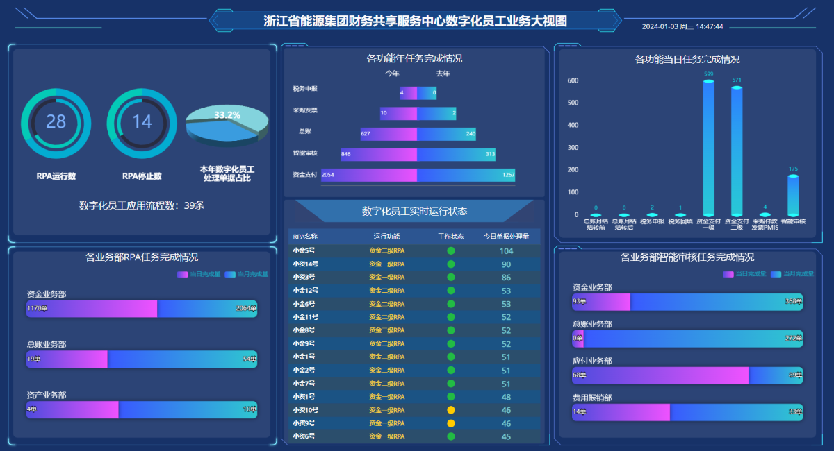 浙能財(cái)務(wù)共享運(yùn)營平臺(tái)上線以來已推廣21批線上運(yùn)行427家單位,開發(fā)129支標(biāo)準(zhǔn)化流程,與SAP等20個(gè)業(yè)財(cái)系統(tǒng)實(shí)現(xiàn)集成,覆蓋用戶3萬余人,從無到有打造以智能化、流程和數(shù)據(jù)驅(qū)動(dòng)、業(yè)財(cái)稅資檔一體貫通、財(cái)務(wù)風(fēng)險(xiǎn)控制和財(cái)務(wù)人才培養(yǎng)為主,富有浙能特色、不斷迭代升級(jí)、賦能價(jià)值創(chuàng)造的財(cái)務(wù)共享金名片,走在浙江國資國企前列。在數(shù)智化方面,該平臺(tái)采用統(tǒng)一架構(gòu)的端到端數(shù)字化平臺(tái),利用IPA智能流程自動(dòng)化、OCR智能審核、AI、NLP自然語言處理、全場景遠(yuǎn)程辦公等先進(jìn)技術(shù)手段,搭建起流程、審核、運(yùn)營和數(shù)治四個(gè)方面組成的智能應(yīng)用體系,實(shí)現(xiàn)憑證和支付自動(dòng)化率雙雙超過99%,其中數(shù)字員工、數(shù)字化監(jiān)督看板、智能語音提單、智能派單、智能客服等一批功能應(yīng)用頗具特色、業(yè)內(nèi)領(lǐng)先,榮獲上國會(huì)“2022年智能財(cái)務(wù)最佳實(shí)踐年度綜合大獎(jiǎng)”。