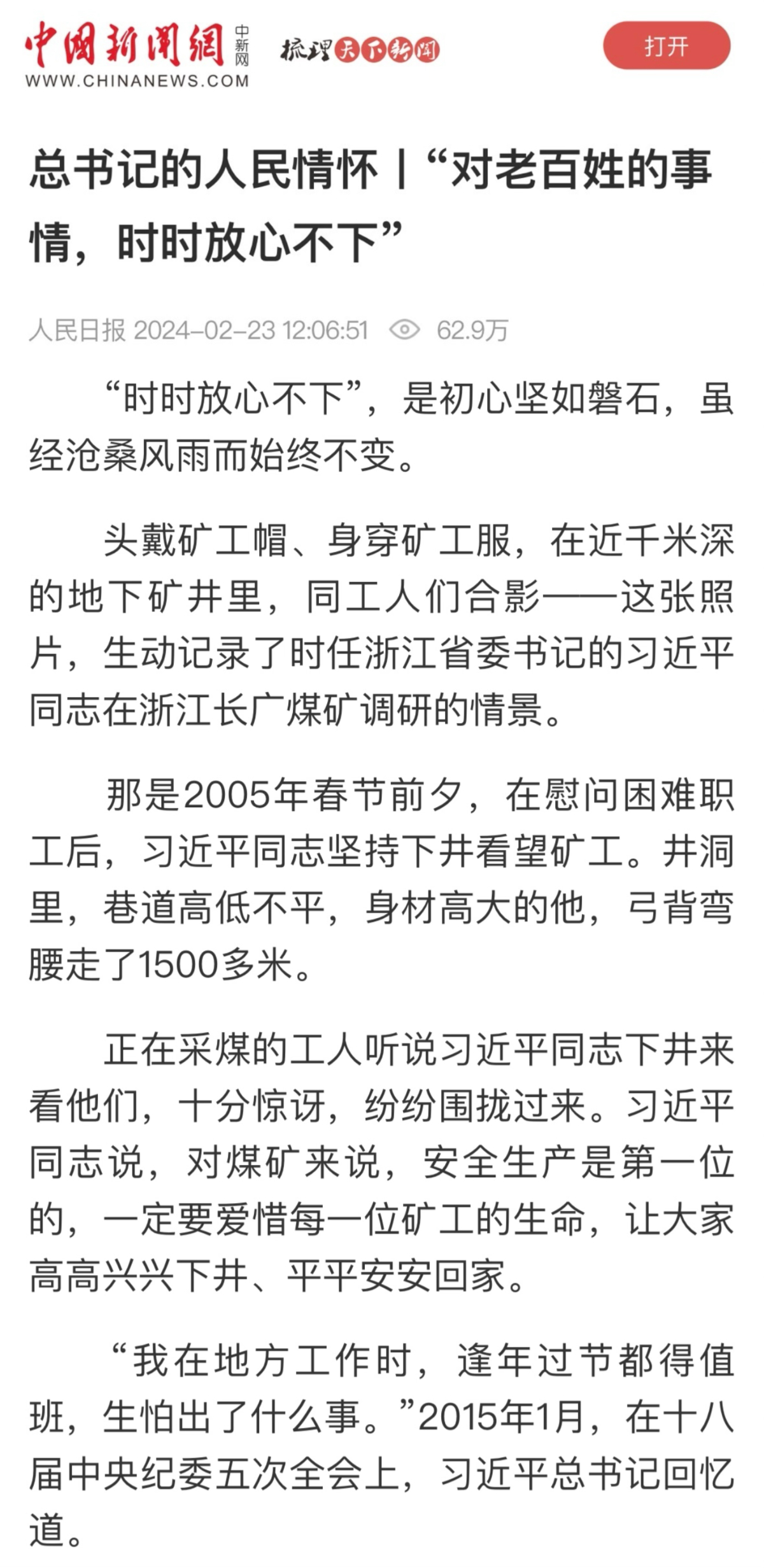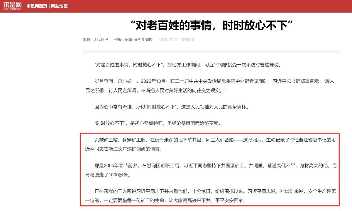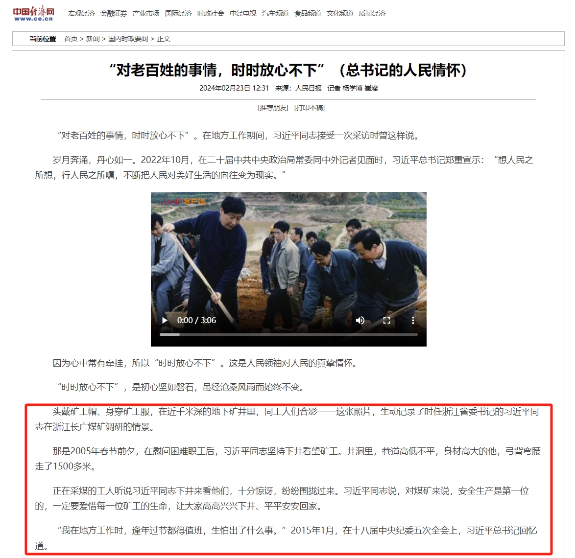 本網訊 2月23日,《人民日報》頭版頭條刊登《總書記的人民情懷|“對老百姓的事情,時時放心不下”》,光明網、求是網、中國新聞網、中國日報中文網、中國經濟網等多家央媒頭版轉載。“以時時放心不下的責任感、積極擔當作為的精氣神為黨和人民履好職、盡好責”,這是習近平總書記對廣大黨員、干部的殷切囑托,也是一個百年大黨走好新的趕考之路的底氣所在。 文中記錄了習近平總書記的調研故事,其中第一個講述的就是時任浙江省委書記習近平同志到長廣煤礦調研的故事。