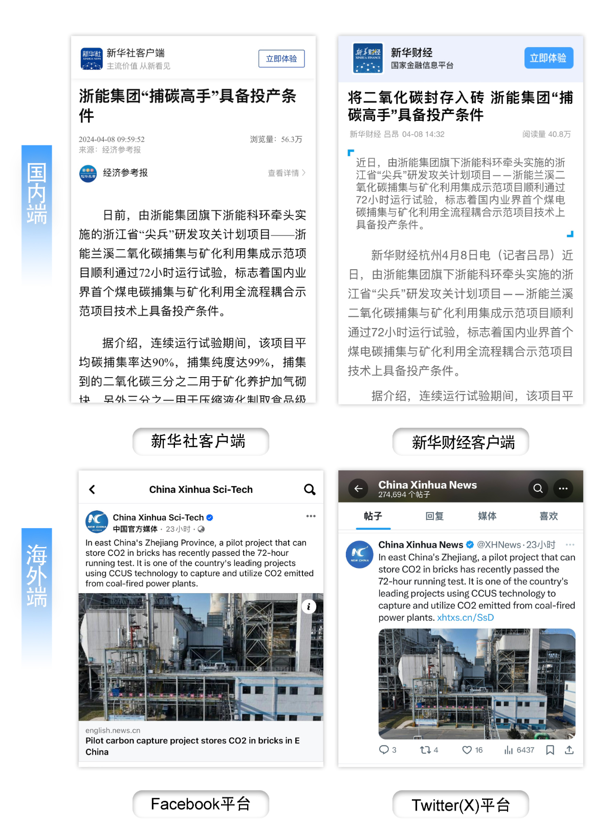 4月8日-4月9日,新華社客戶端、新華財經(jīng)客戶端及新華社facebook、Twitter(X)等社交媒體官方賬號報道《浙能集團“捕碳高手”具備投產(chǎn)條件》。 新華社 圖