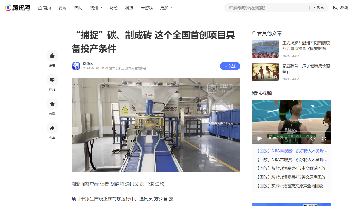 4月1日,騰訊網(wǎng)轉(zhuǎn)載報道《“捕捉”碳、制成磚 這個全國首創(chuàng)項目具備投產(chǎn)條件》。 騰訊網(wǎng) 圖