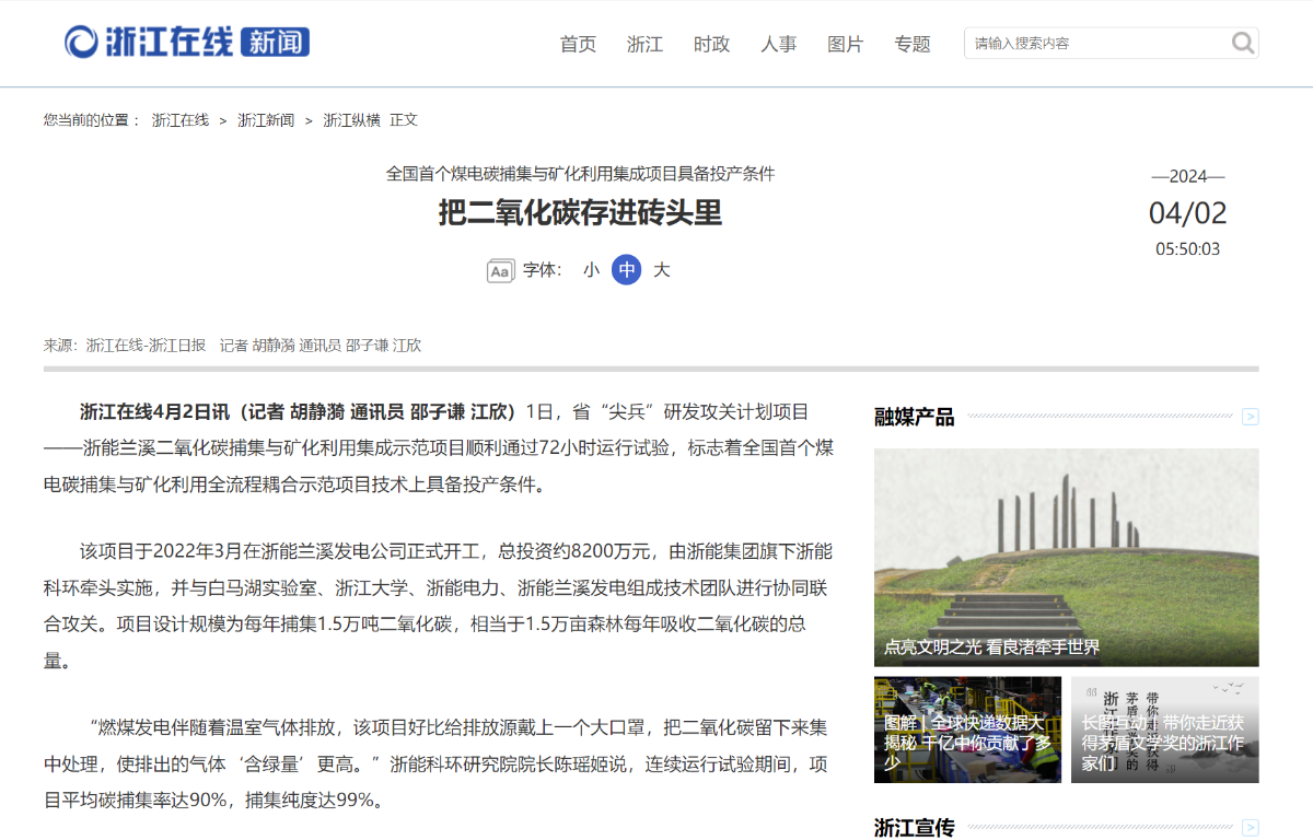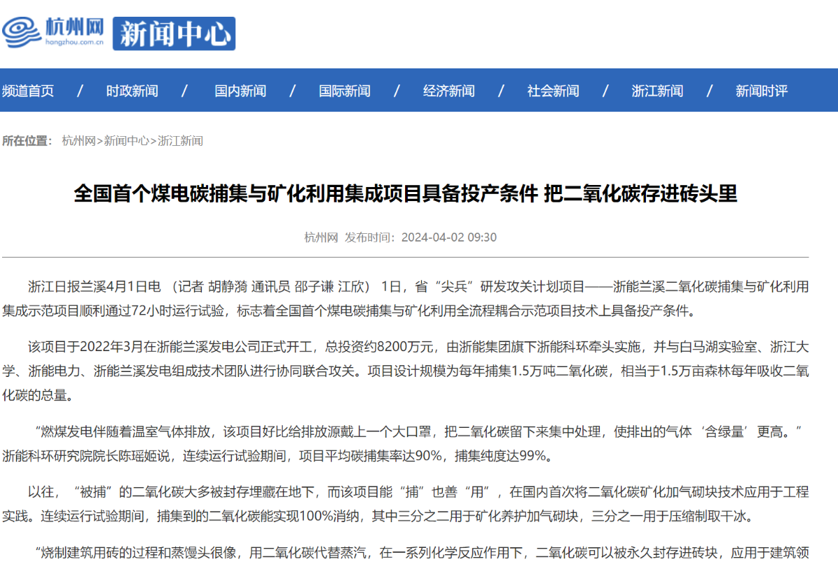 4月2日,浙江在線報道《全國首個煤電碳捕集與礦化利用集成項目具備投產(chǎn)條件 把二氧化碳存進磚頭里》。 浙江在線 圖