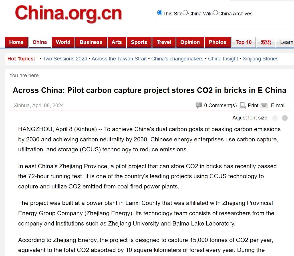 4月8日,中國網(wǎng)英文版報道《Across China: Pilot carbon capture project stores CO2 in bricks in E China》。 中國網(wǎng) 圖