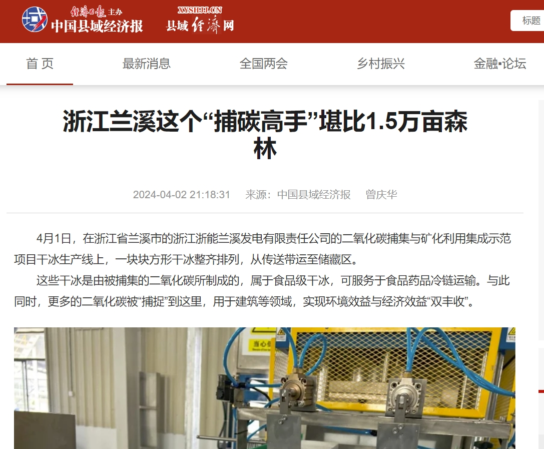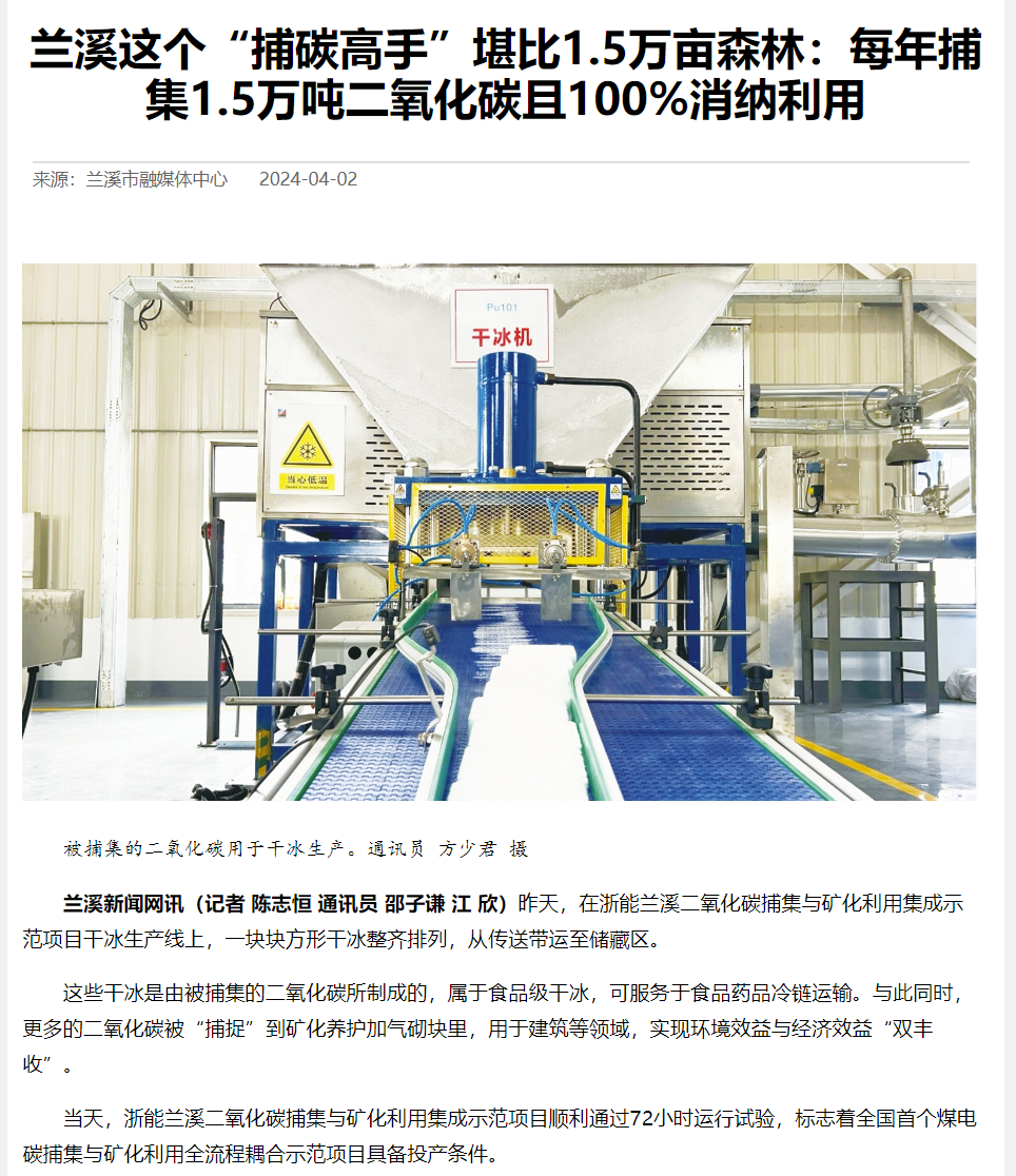 4月1日,蘭溪新聞網(wǎng)報道《蘭溪這個“捕碳高手”堪比1.5萬畝森林:每年捕集1.5萬噸二氧化碳且100%消納利用》。 蘭溪新聞網(wǎng) 圖