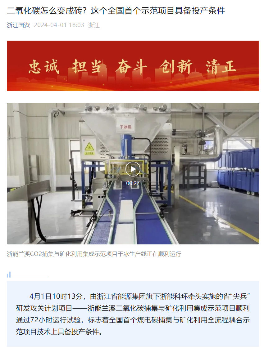 4月1日,省國資委“浙江國資”公眾號發(fā)布《二氧化碳怎么變成磚?這個全國首個示范項目具備投產(chǎn)條件》。 浙江國資公眾號 圖