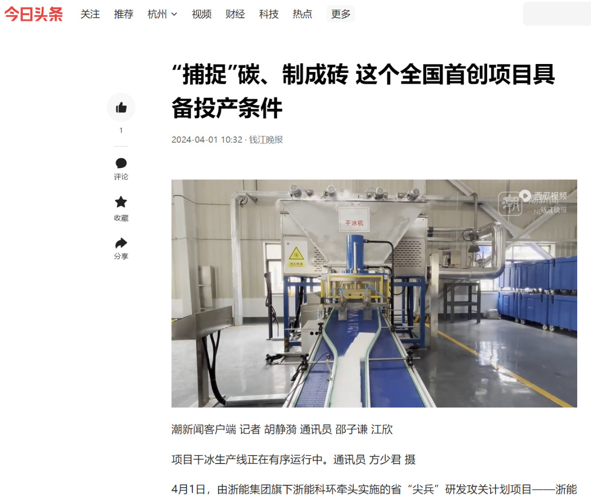 4月1日,今日頭條轉(zhuǎn)載報道《“捕捉”碳、制成磚 這個全國首創(chuàng)項目具備投產(chǎn)條件》。 今日頭條 圖