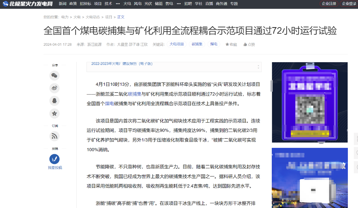 4月1日,北極星火力發(fā)電網(wǎng)轉(zhuǎn)載報道《全國首個煤電碳捕集與礦化利用全流程耦合示范項目通過72小時運行試驗》。 北極星火力發(fā)電網(wǎng) 圖