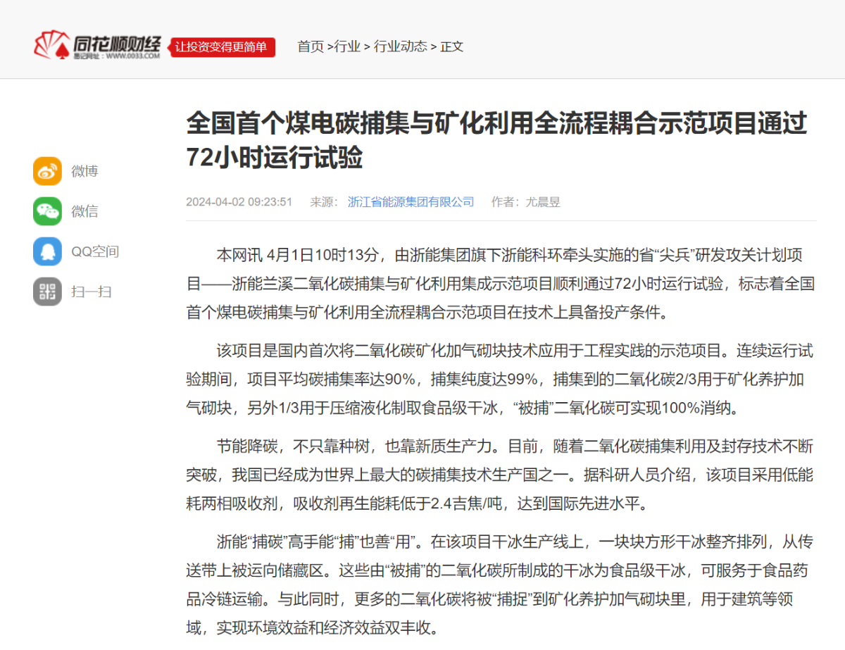4月2日,同花順財經(jīng)報道《全國首個煤電碳捕集與礦化利用全流程耦合示范項目通過72小時運行試驗》。 同花順財經(jīng) 圖