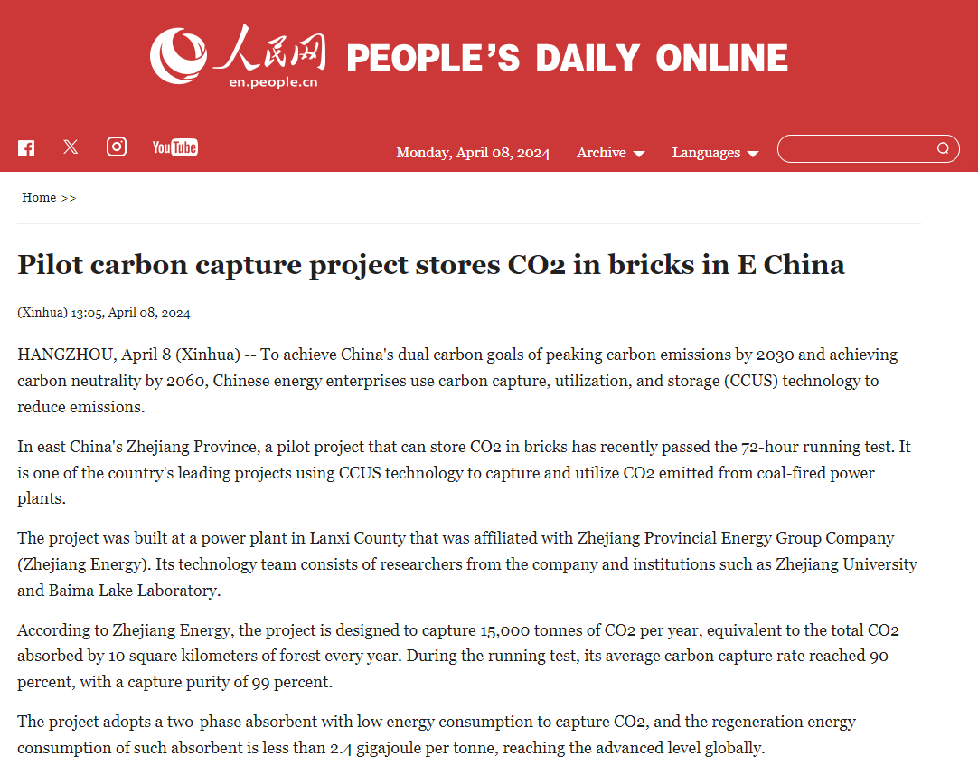 4月8日,人民日報旗下人民網(wǎng)英文版報道《Pilot carbon capture project stores CO2 in bricks in E China》。 人民網(wǎng)英文版 圖