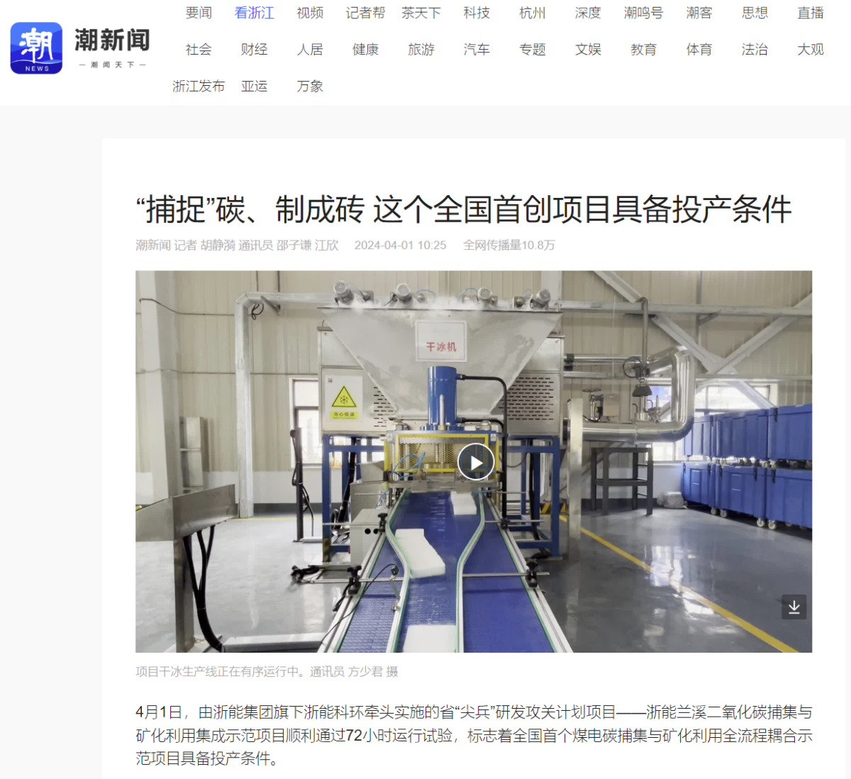 4月1日,浙報集團潮新聞客戶端報道《“捕捉”碳、制成磚 這個全國首創(chuàng)項目具備投產(chǎn)條件》。 潮新聞客戶端 圖