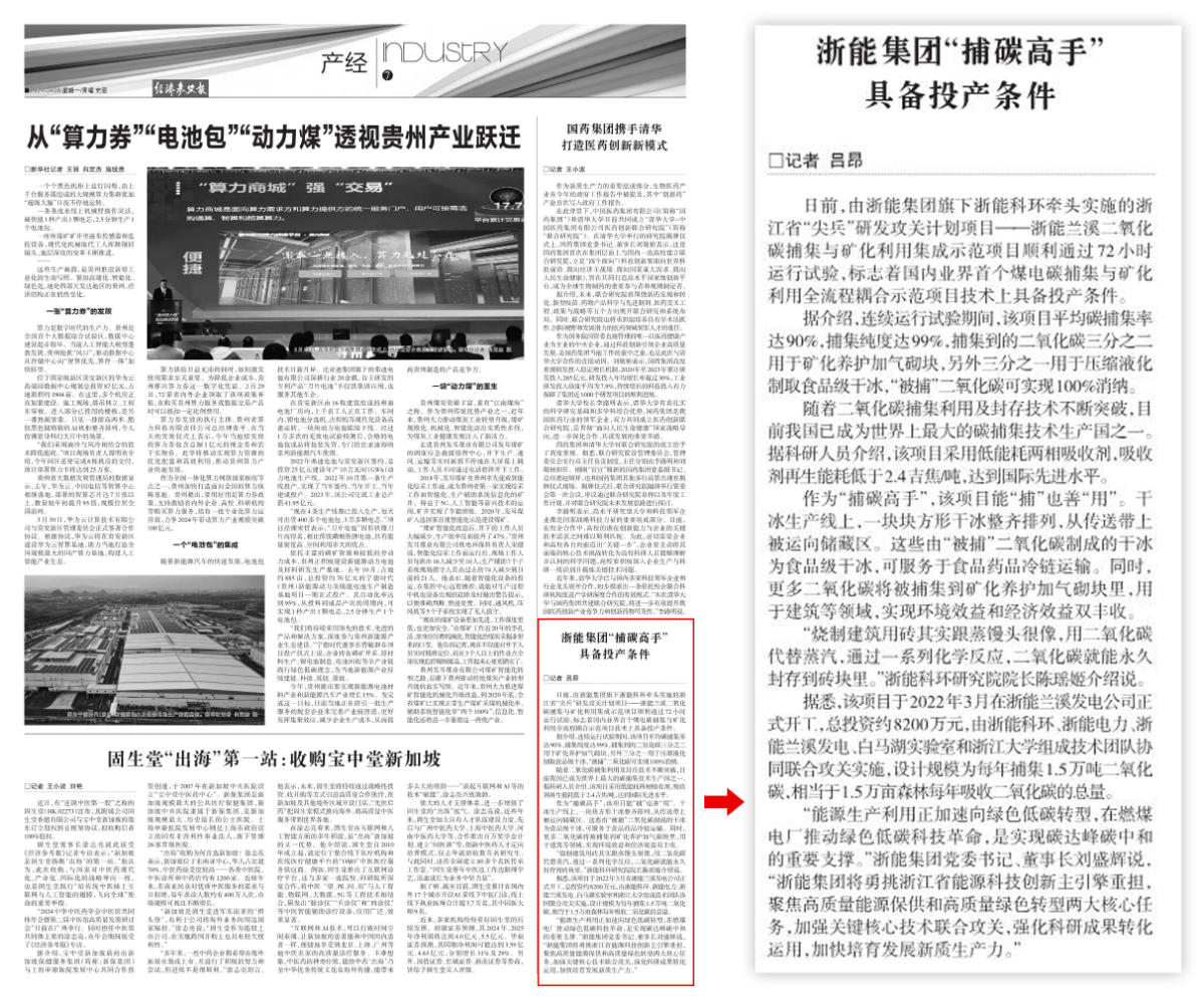 4月8日,新華社主管主辦經(jīng)濟參考報報道《浙能集團“捕碳高手”具備投產(chǎn)條件》。 經(jīng)濟參考報 圖