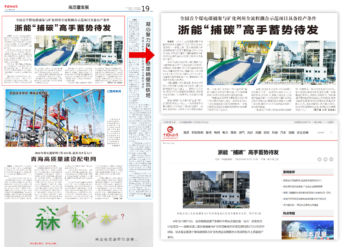 4月8日,人民日報旗下《中國能源報》版面頭條《浙能“捕碳”高手蓄勢待發(fā)》。 中國能源報 圖
