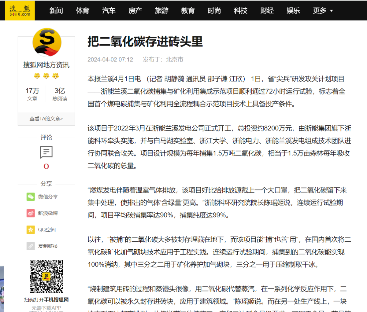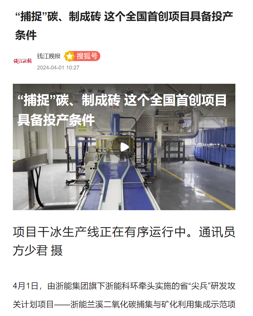 4月1日,錢江晚報搜狐號轉(zhuǎn)載報道《“捕捉”碳、制成磚 這個全國首創(chuàng)項目具備投產(chǎn)條件》。 錢江晚報搜狐號 圖