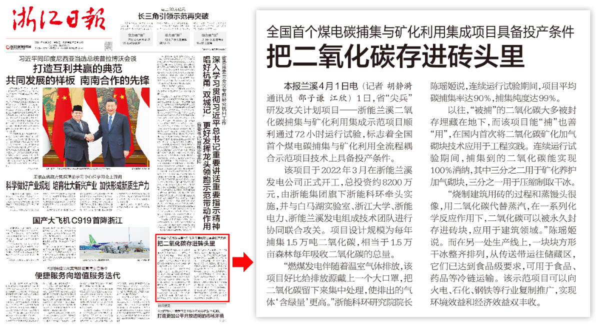 4月2日,《浙江日報》頭版刊登浙能新聞《全國首個煤電碳捕集與礦化利用集成項目具備投產(chǎn)條件 把二氧化碳存進磚頭里》。 浙江日報 圖
