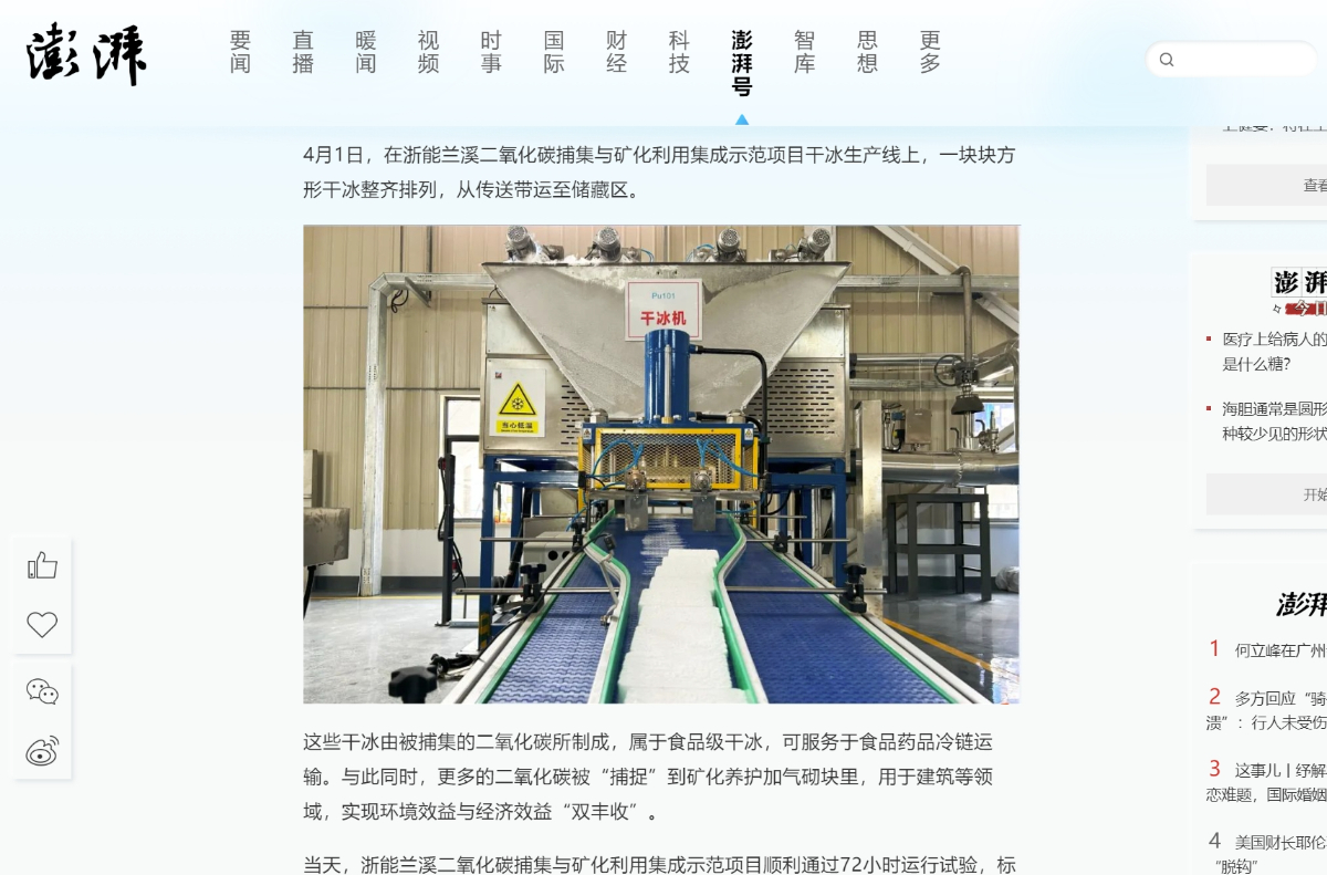 近日,浙能蘭溪二氧化碳捕集與礦化利用集成示范項目順利通過72小時運行試驗,標(biāo)志著全國首個煤電碳捕集與礦化利用全流程耦合示范項目在技術(shù)上具備投產(chǎn)條件,項目新聞獲新華社、人民網(wǎng)、浙江日報、中國能源報、潮新聞、浙江國資公眾號、騰訊網(wǎng)、搜狐網(wǎng)、今日頭條、浙江在線等平臺聚焦。